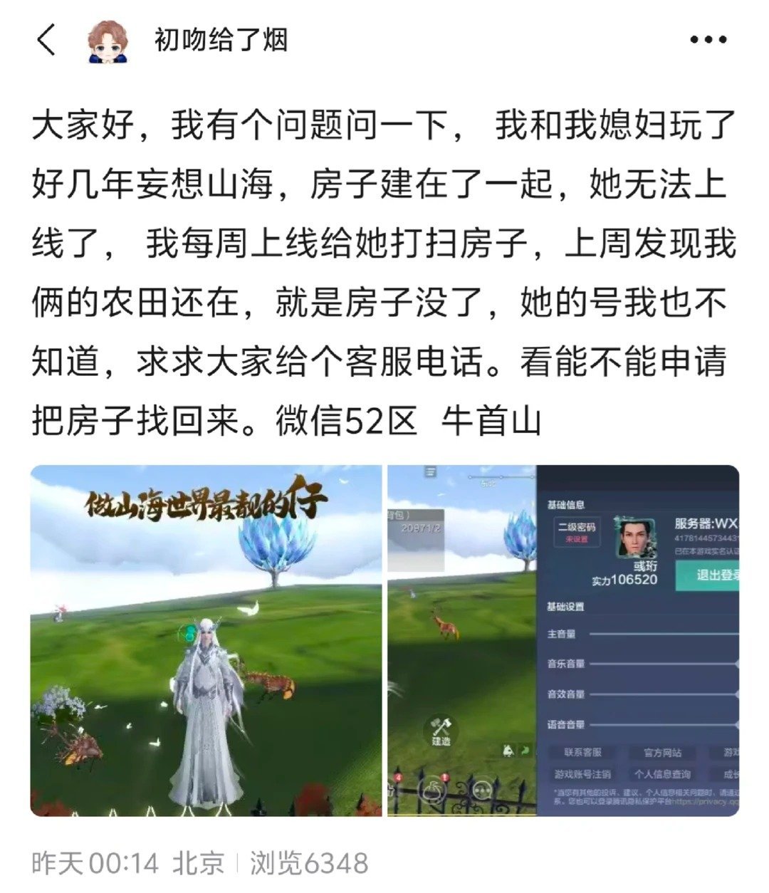 2025年11月26日,丈夫上线发现房屋离奇消失仅剩农田,因妻子去世后无法通过人脸识别登录其账号,多次联系客服未果后发帖求助。据玩家推测,房屋可能因游戏"全图PVP机制"被其他玩家拆除。《妄想山海》允许自由拆除他人建筑,且部分必需材料需在自由PK地图采集,易遭偷袭。