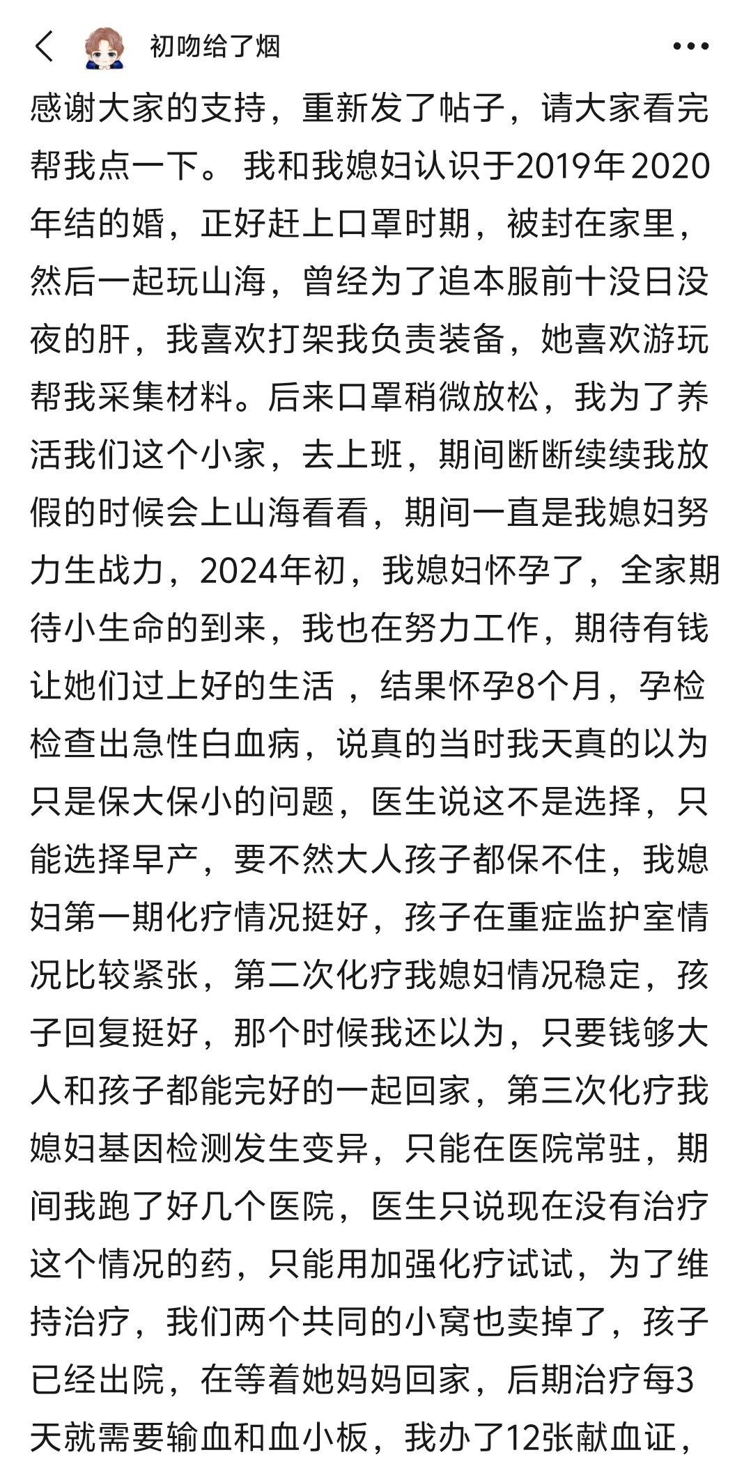 一对夫妻自2019年相识于手游《妄想山海》,妻子在游戏中耗费数月搭建虚拟房屋作为两人情感见证。2024年初,妻子怀孕,孕期8个月时罹患急性白血病。宝宝生下来就进了重症监护室,虽全力抢救,但妻子还是在今年4月去世。游戏里妻子搭建的虚拟住宅,成了男子的重要精神寄托,他会定期上线打理。