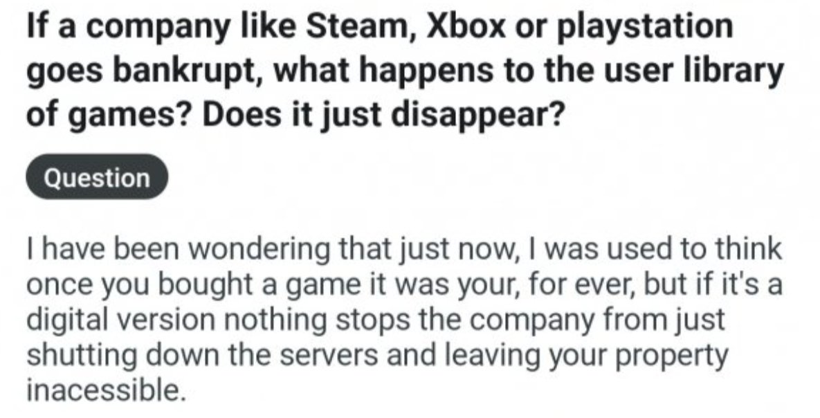 近期,Reddit论坛上一则关于“Steam破产后游戏库是否会消失”的提问引发广泛共鸣。提问者担忧,一旦Steam关闭服务器,花费大量金钱购买的数字游戏将无法访问。这话题击中了数字时代玩家的普遍焦虑:我们以为的“购买”实为“租赁”。