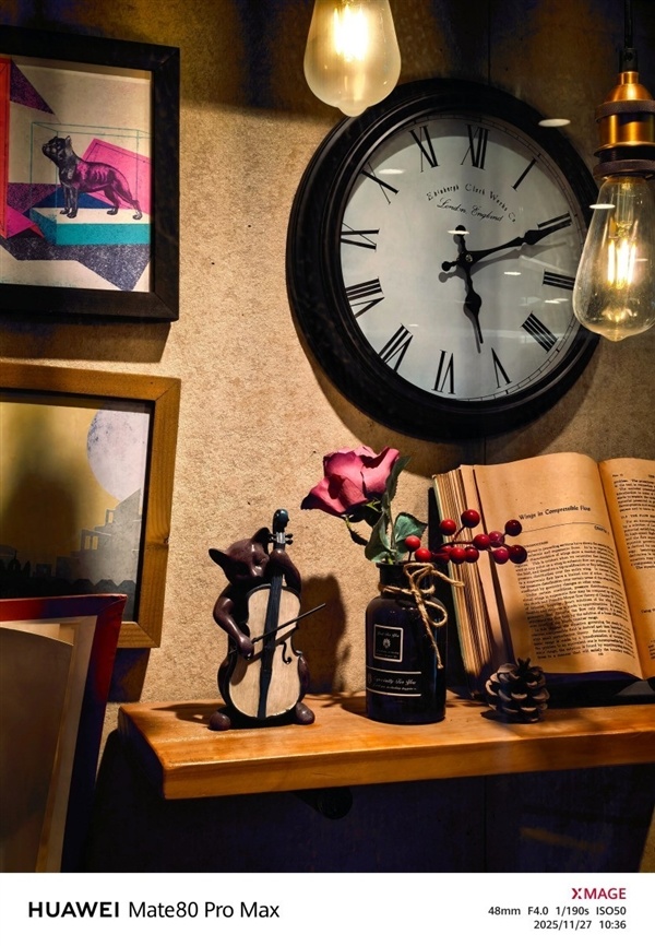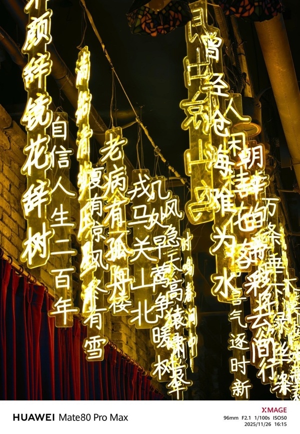 在暗光条件下的玻璃橱窗,华为Mate80 Pro Max 的画质把摆件纹理、书本纸张质感都拍得很清晰,连灯泡的光晕也柔和不刺眼,玻璃橱窗内部的细节也不会被涂抹掉。这背后就是像素级Local AWB和三维色域映射的功劳,可以让画面接近肉眼真实所见。