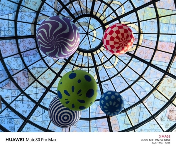 比如说上面这张室内逆光拍摄的照片,光线透过穹顶漫射下来,而气球间的缝隙光影和底部的阴影清晰却不杂乱,画面既有立体感又显高级,色彩还原也十分精准。