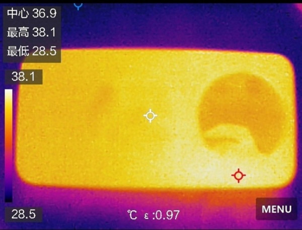 散热方面,华为Mate 80 Pro Max配备了雪绒毛细VC与双相变材料,配合金属机身提高了散热能力,热量不会只集中在某一处,而是快速传导到了整个机身。在30分钟的游戏的测试下,机身最高温度只有38.1摄氏度,表现优异。