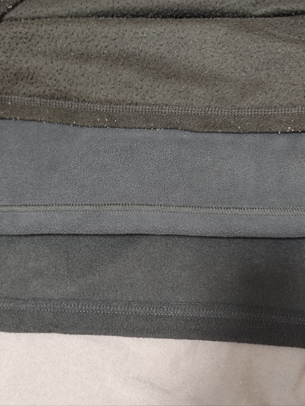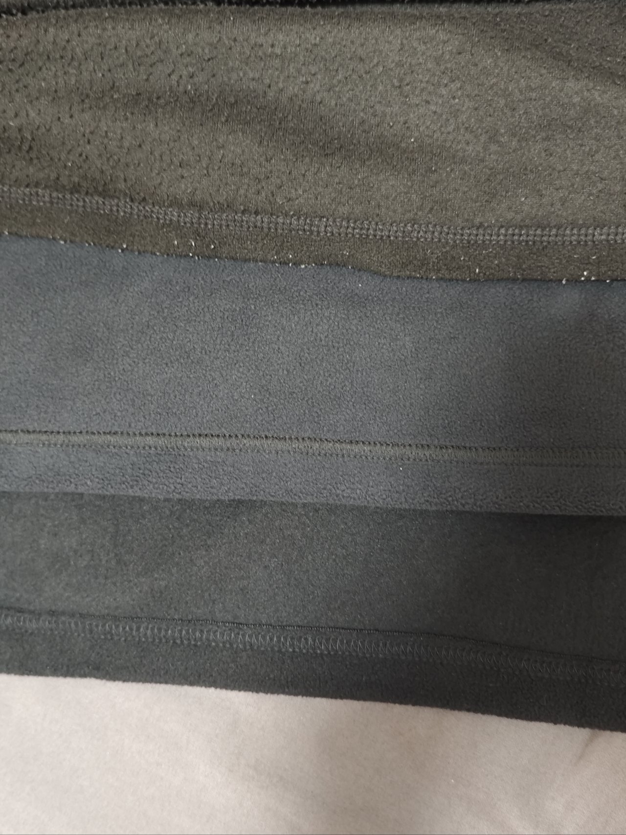 面料手感:厚度在三款中为最薄的,表层摸起来是较为粗糙的抓绒;内在差距很大,内层抓绒很稀疏,能很明显的看到一根根绒,廉价感较明显,这玩意应该算单层抓绒?