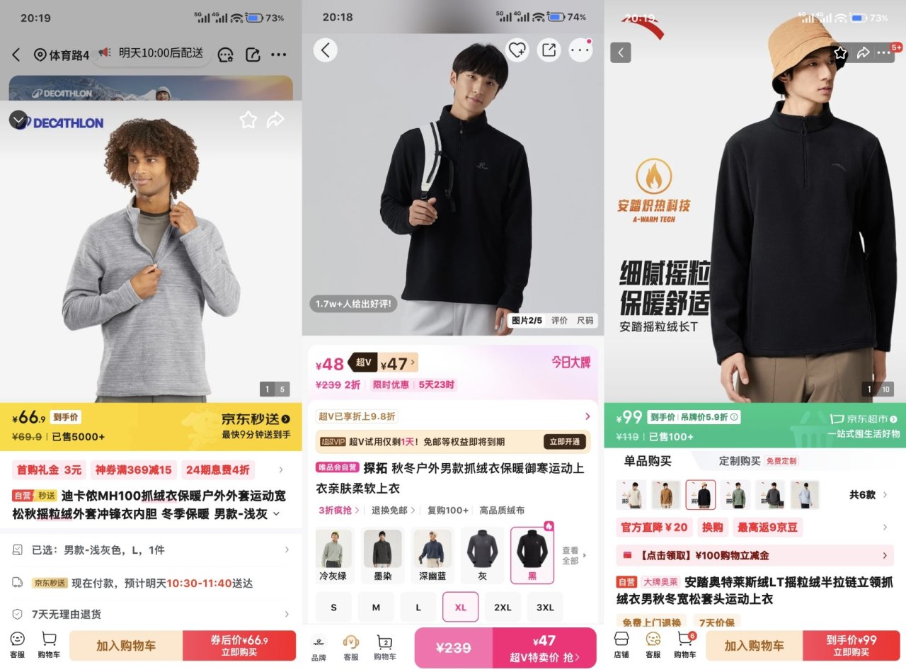 外绒对比:从上到下分别为迪卡侬、安踏、探拓