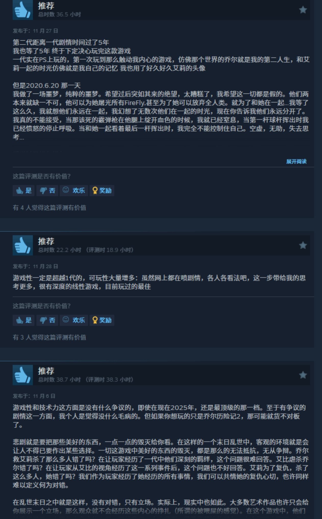 此次登陆PC的复刻版凭借优秀的技术优化赢得玩家认可。许多评价指出,相比前作《最后生还者第一部》PC版初期的优化问题,本次复刻版在键鼠适配、帧率稳定性和着色器加载效率上均有明显改善。尽管游戏剧情自2020年发售以来始终伴随争议,但PC版推出近一年后,玩家评价更趋理性。多数好评玩家认为,抛开初期对剧情的争议,复刻版在战斗机制打磨、角色情感刻画与细节补充上的表现“无可挑剔”。
