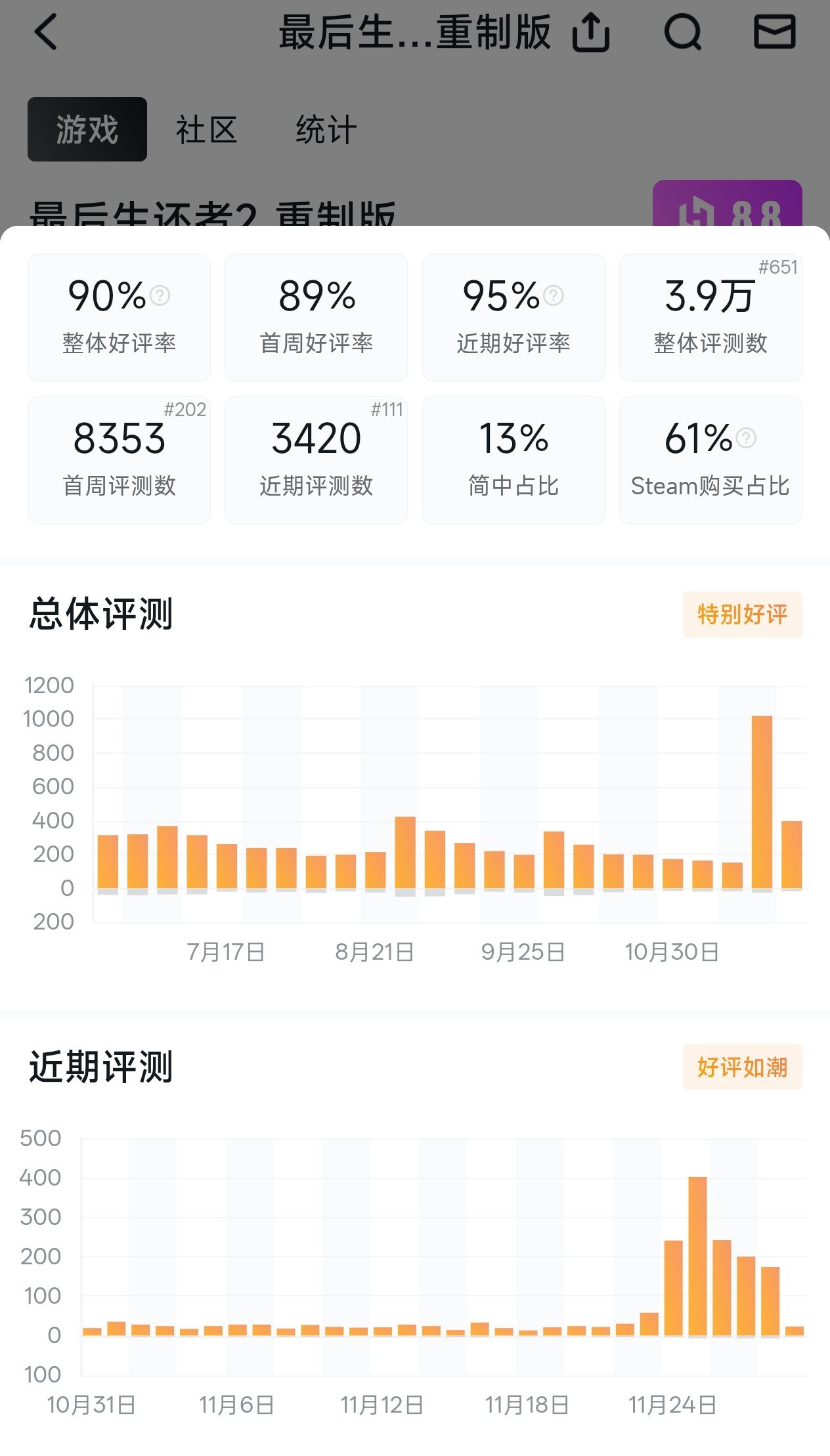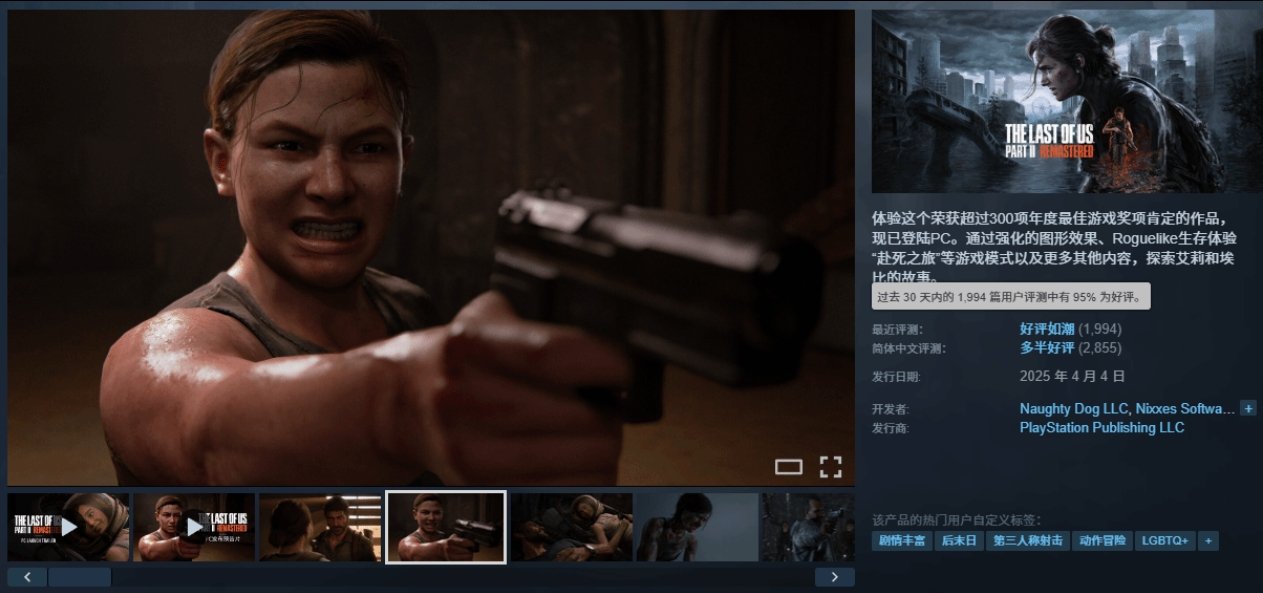 近日,《最后生还者2:复刻版》在Steam平台简中区近30天好评率飙升至95%,达到“好评如潮”级别。这一数据对比游戏累计78%的整体好评率,显示玩家评价趋势显著提升。