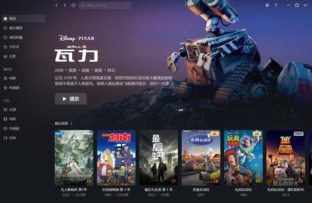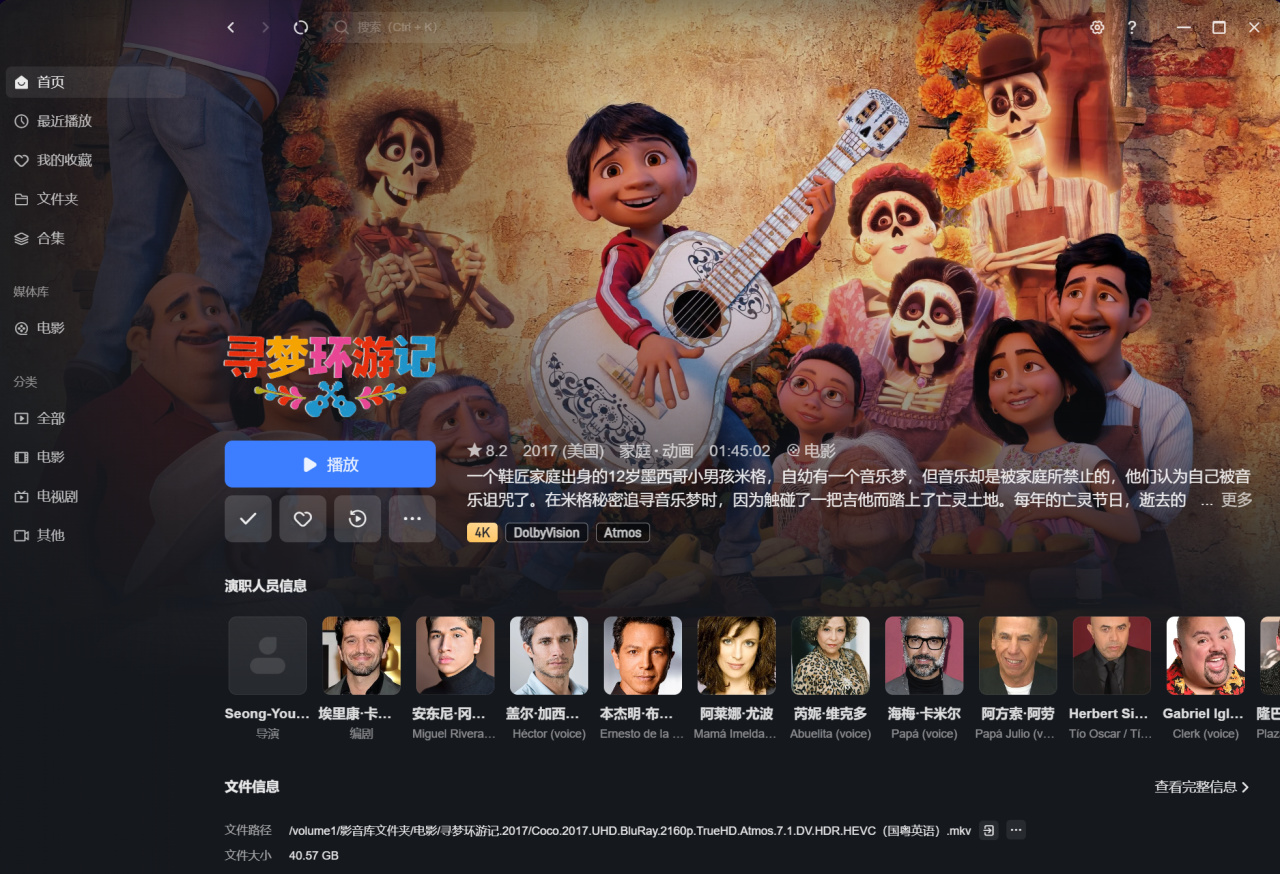 无论是电脑端还是电视端,其UI设计都十分的优秀,影音库还支持了排序记忆,影视的详情页不仅提供了评分,而且显示了内容的分辨率与格式信息,可以说整体使用体验上相较国际主流的几个流媒体网站也不遑多让。