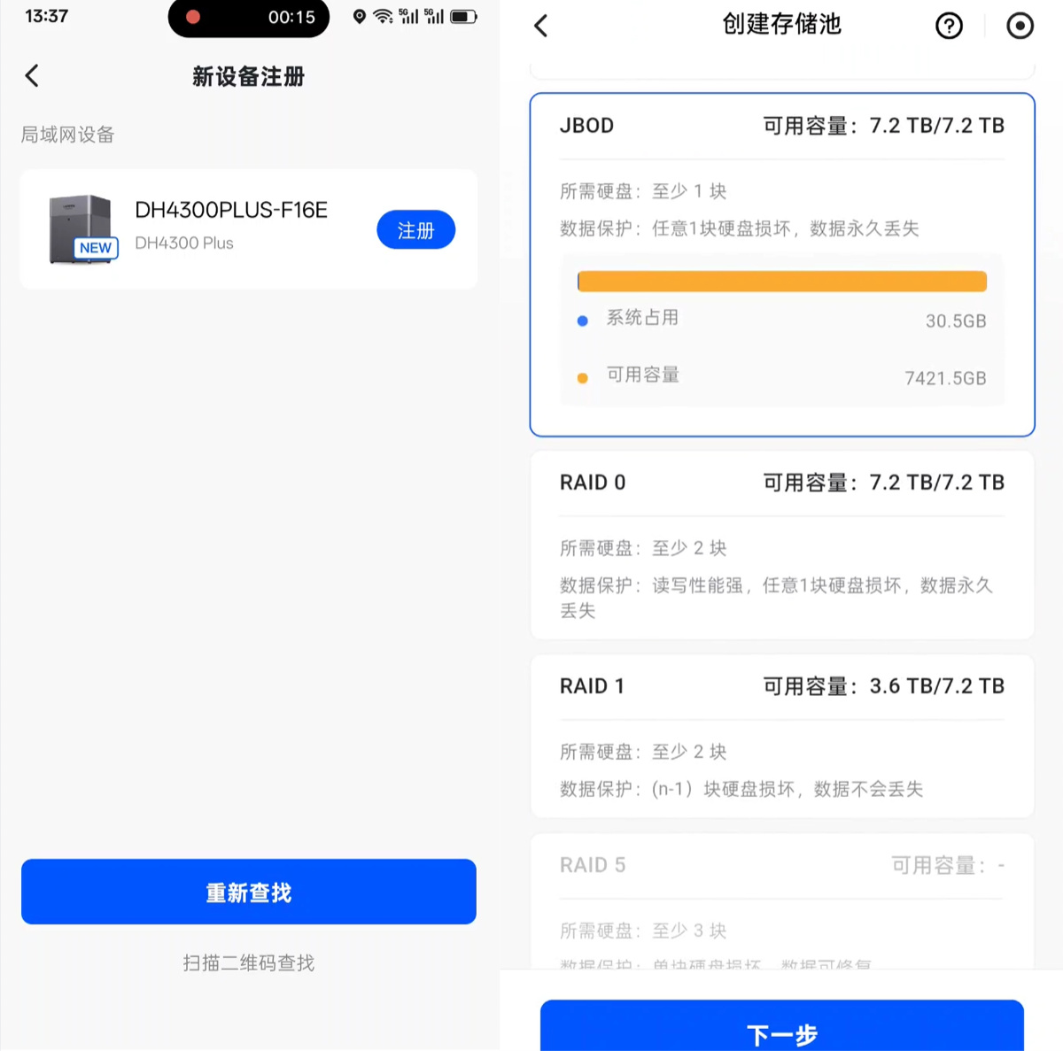 手机端的初始化非常简单易懂,还有基础操作的快速教学,给长辈们打造影音库的话,也不怕他们不会用了。唯一值得注意的是储存池的建立,这个还是要根据自己的情况进行选择的,如果不懂的话建议仔细阅读RIAD类型描述或咨询比较懂的朋友。