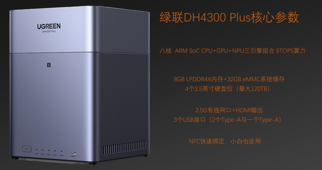 首先简单介绍一下绿联DH4300 Plus的参数吧,它拥有一颗ARM A55-A76架构的八核SoC,CPU+GPU+NPU三引擎组合,同时还有专门用于视频播放转码的VPU,以保障视频流畅不卡顿,同时NPU的6TOPS算力的加入使得NAS在运行诸如照片人脸识别等AI功能时仍不过多占用CPU性能,进而做到多任务并发不卡顿。