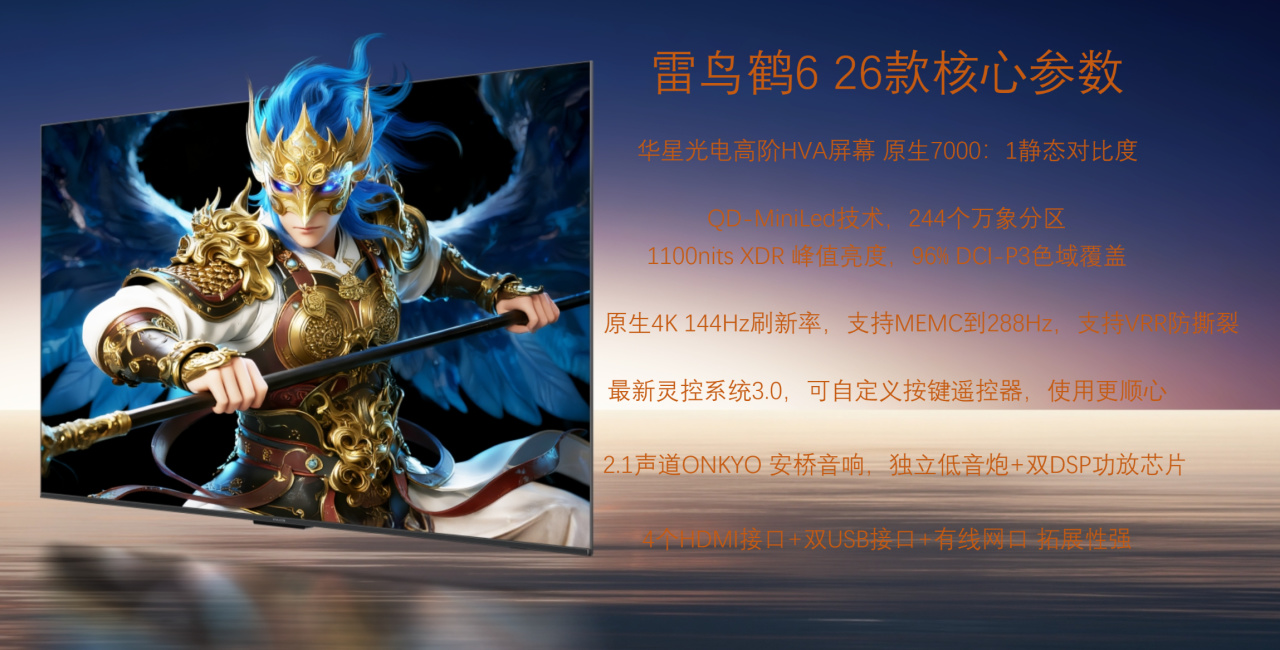 紧接着介绍一下我这款65英寸的雷鸟鹤6 26款吧,它搭载华星光电的高阶HVA屏幕,静态对比度高达7000:1,分辨率为4K,原生刷新率144Hz,支持MEMC到288Hz并且支持Freesync Premium Pro,连接主机玩游戏时画面流畅无撕裂卡顿。