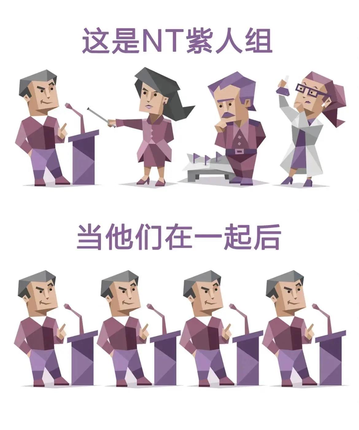 紫色是一种不日常的,有点边缘又有高级感的颜色。所以被用来形容不走常规路的NT人。