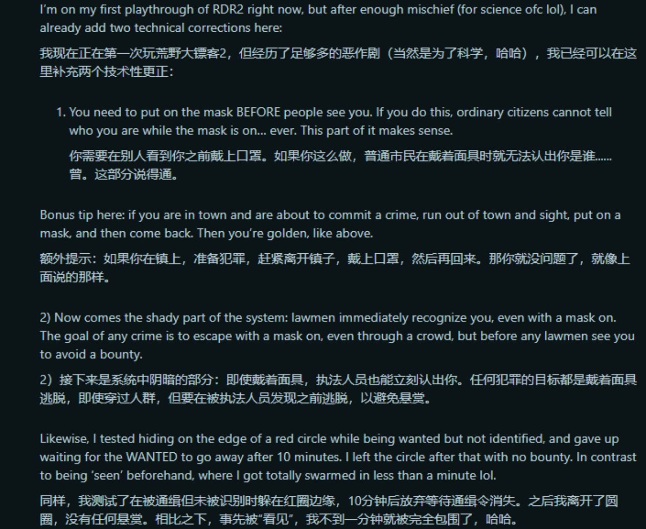 许多玩家遭遇过类似情况,在无人目击的密闭空间完成行动后,依然立即被系统判定为通缉状态。有玩家分析,游戏中的目击机制分为“暗红色”和“鲜红色”两种状态。一旦目击者成功报案并变为“鲜红色”,玩家即使更换服装或戴上面罩也难以避免被通缉。除了密闭空间内的“幽灵目击者”问题,圣丹尼斯的警察也被玩家吐槽过于敏感。有玩家反映,哪怕只是骑马轻微碰撞行人,都可能引发警方直接开枪。
