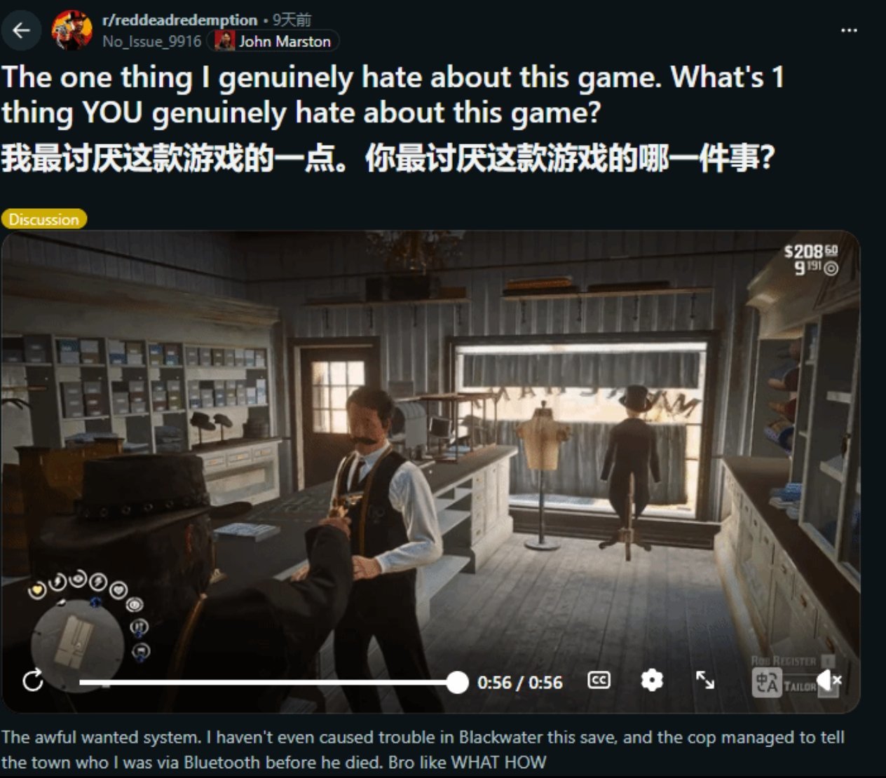近日,一位ID为LaidToRest_04的玩家在Reddit上分享了一段《荒野大镖客2》的游戏经历,对游戏的通缉系统提出质疑。他在黑水镇一个房间内悄无声息地解决了两名NPC,现场并无其他目击者,却依然触发了全镇通缉。该玩家调侃道:“那警察被我打死前,愣是用蓝牙快传把老子身份告诉给全镇人了?”