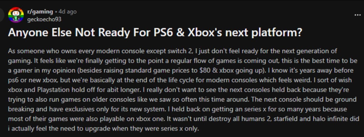 “我还没准备好迎接下一代。”近日,Reddit等玩家社区的热议话题出乎意料地转向了对尚未正式公布的PlayStation 6的抵制。尽管索尼尚未官方发布PS6,但多方传闻推测其可能在2027至2028年问世。这一时间点引发了不少外网玩家的不满情绪。