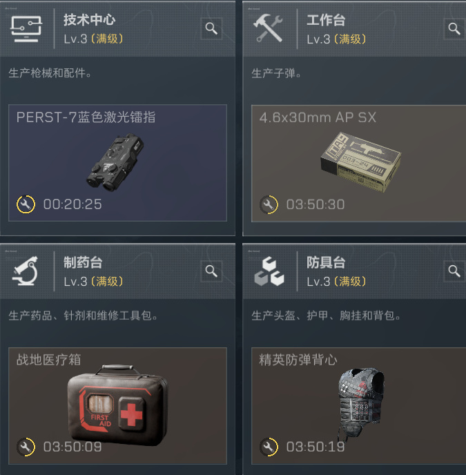 今日特勤处制作:蓝激光,金血包,老赛甲,4.6x30mm金蛋