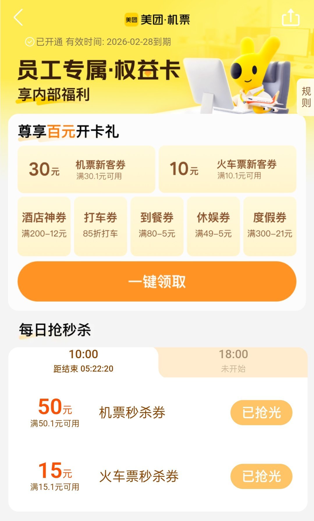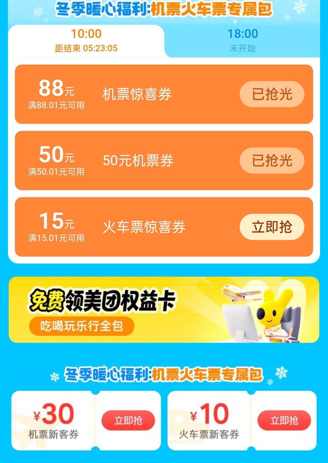 火車高鐵:兩張15元無門檻卷,兩張10元無門檻卷,還有一張5元無門檻卷。