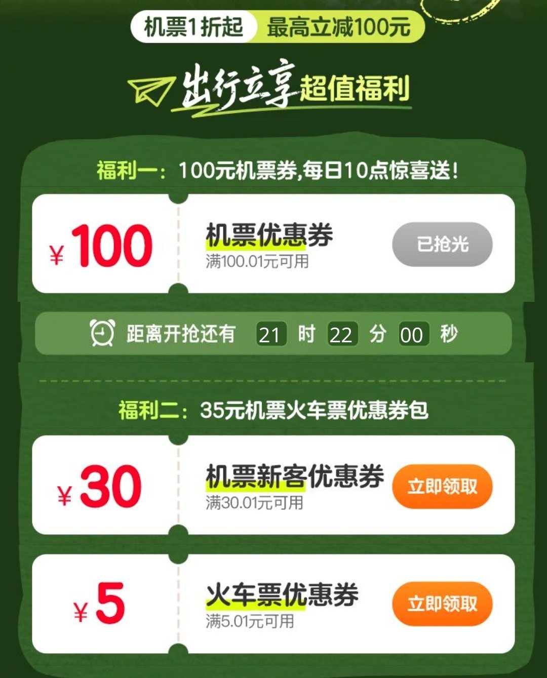 飛機方面的:有一張100元和88元無門檻卷和三張30元無門檻卷,以及兩張50元無門檻卷。