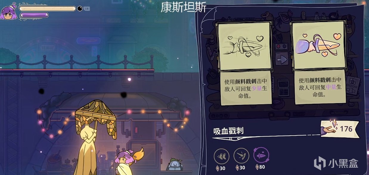 於是康斯坦絲中類似於小騎士能量的顏料槽,並不需要依靠攻擊來獲得。我們操控的主角只要不持續使用技能,顏料槽就可以自動回覆。配合靈感系統中的吸血戳刺,哪怕你是不喜歡戰鬥的“和平主義者”,也可以輕鬆應對各種戰鬥。