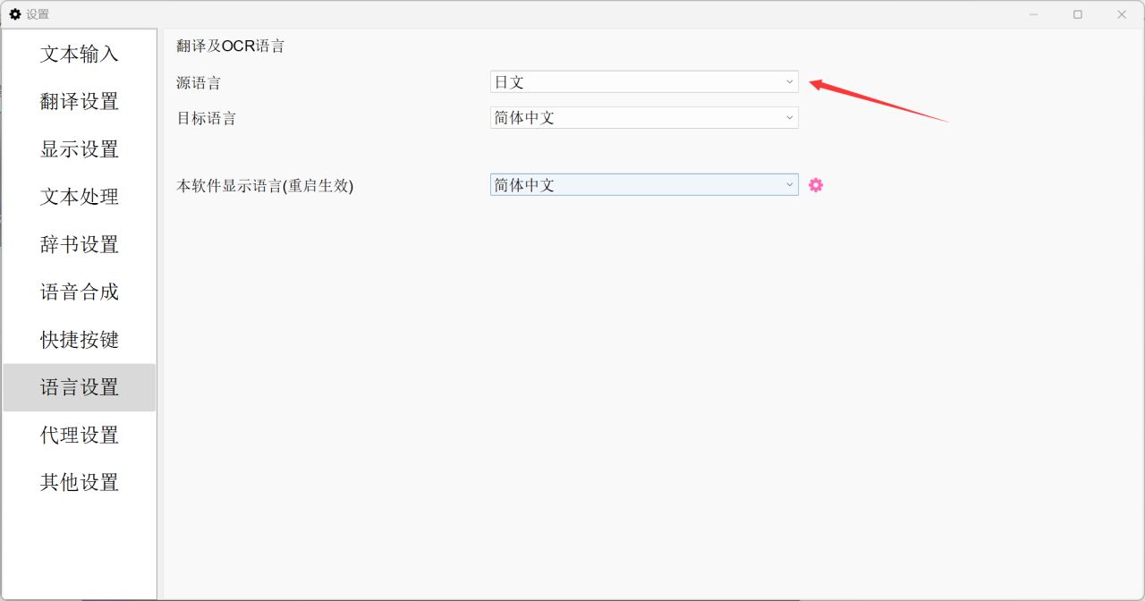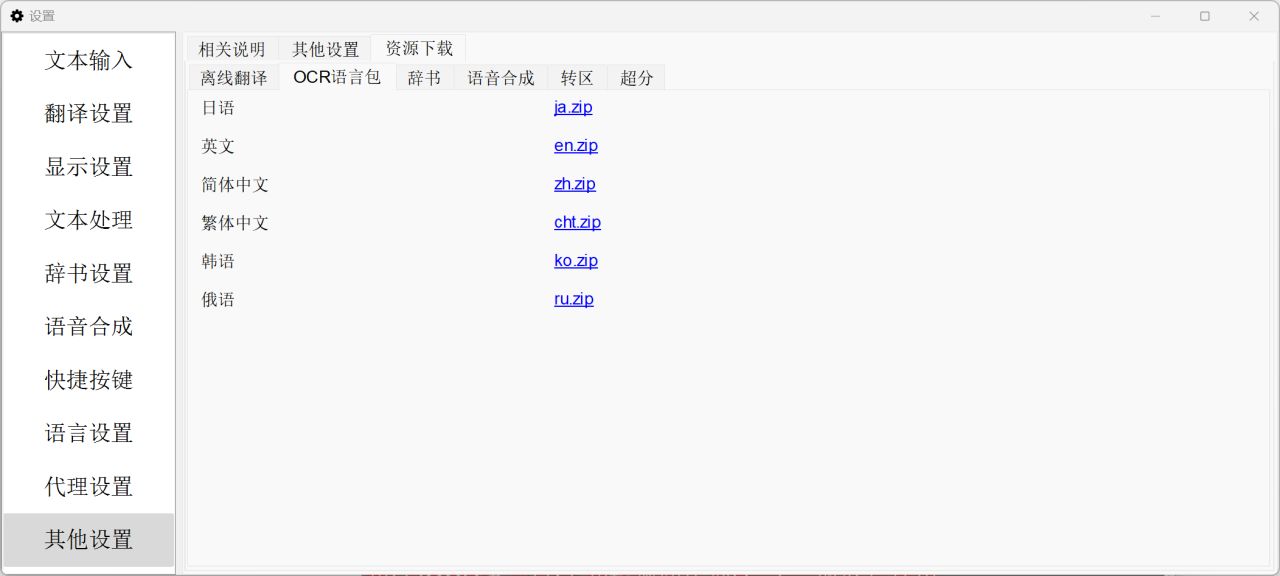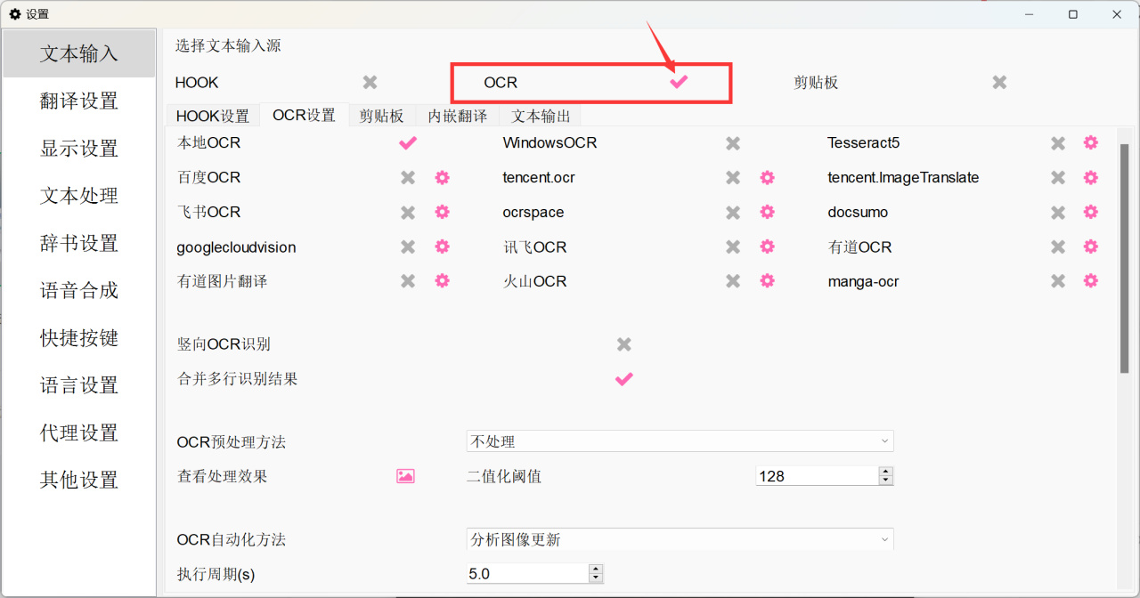 2.在设置界面,我们可以设置OCR引擎、翻译引擎、语言设置等…