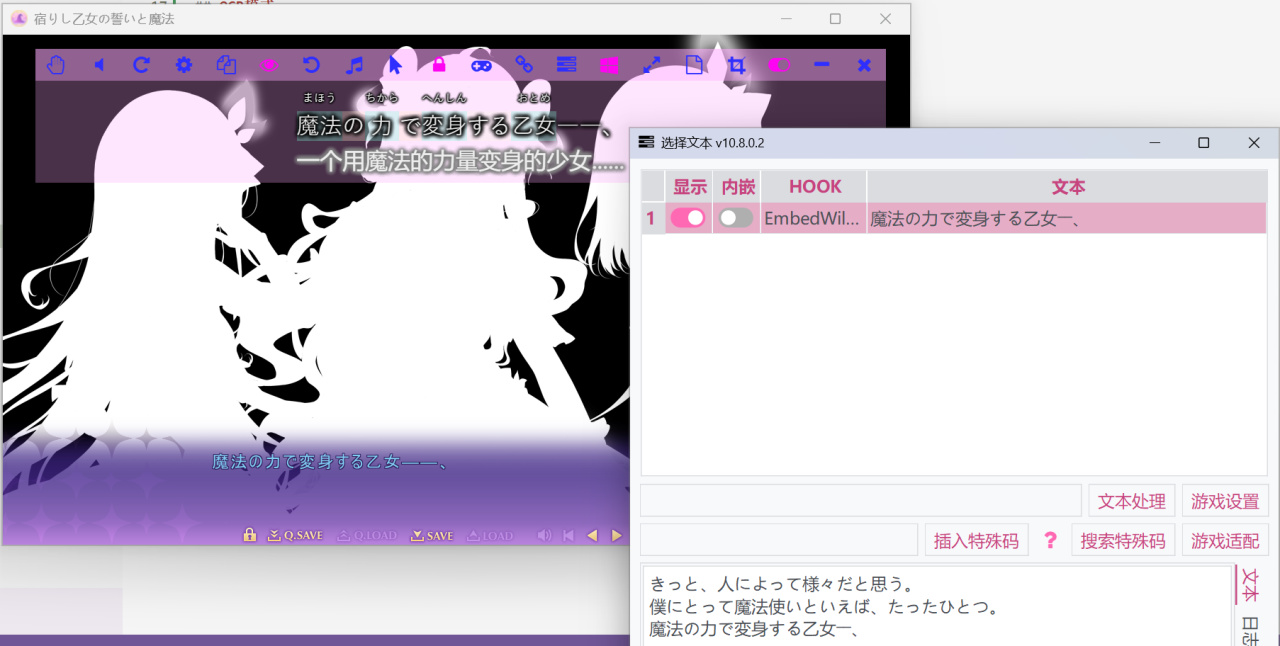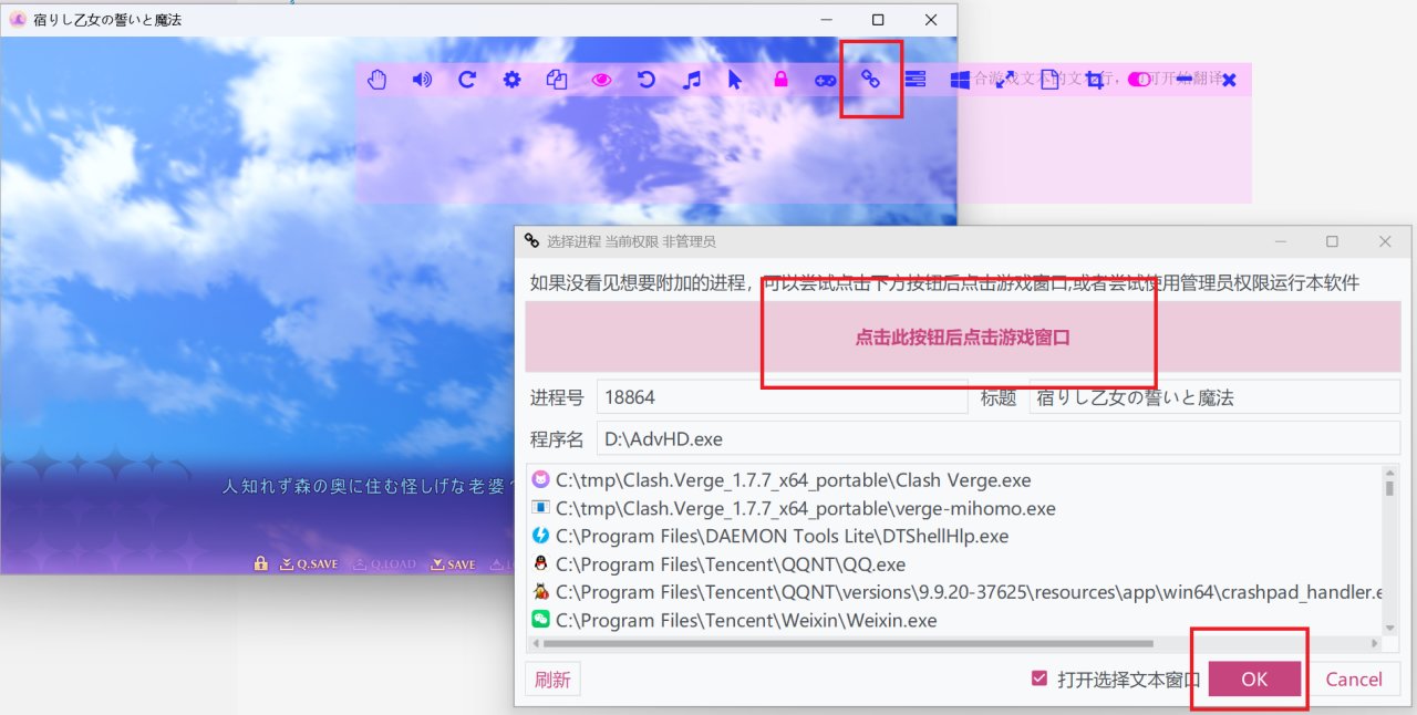 点击确认后,游戏将会被添加到软件中并注入游戏,然后会弹出选择文本窗口。选择文本窗口也可以在工具栏按钮中打开。