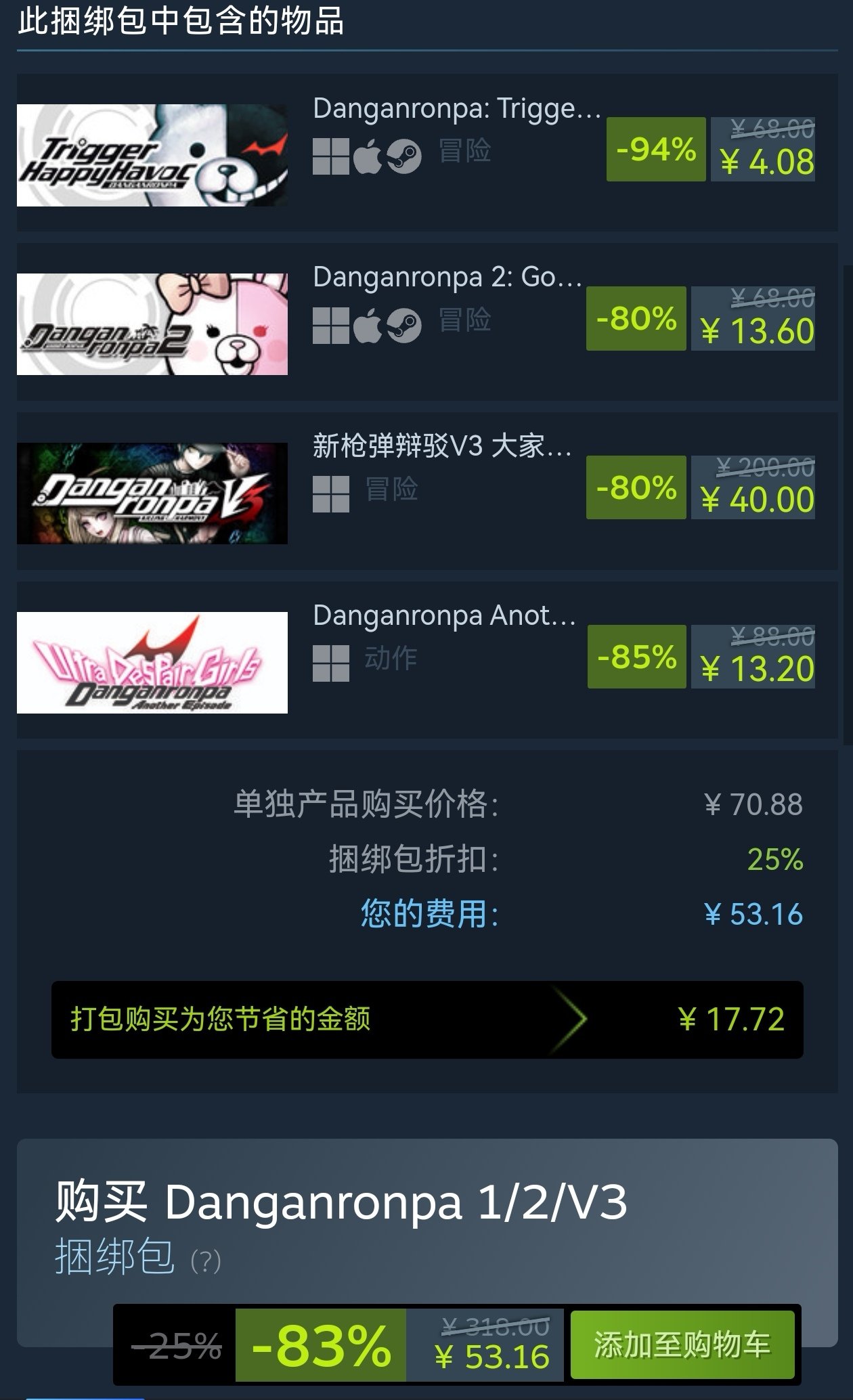 大家好,在最近,《弹丸论破》系列迎来了折扣,其中第一部更是迎来了骨折新史低,神作只用个位数,今天游戏就只剩一天的折扣了,所以还没入手的小伙伴,记得尽快入手,说到底,游戏系列本身就不经常打折,更何况现在的骨折情况更难碰到。