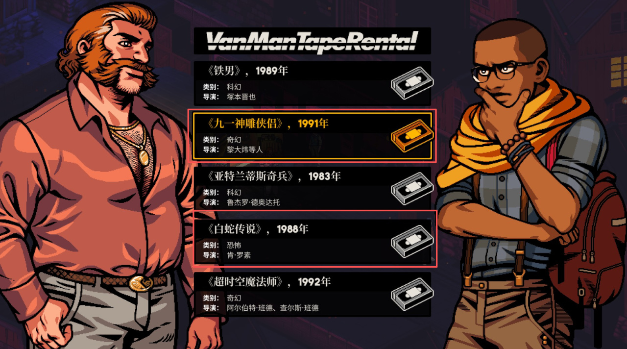 每到週六,玩家可以去後巷定期租借一套錄像帶。這些錄像帶大多是上世紀70、80年代的經典懷舊電影專場,涵蓋意式恐怖片、各種歐美黑幫片,甚至還有我國91年的《神鵰俠侶》和《白蛇傳說》——樣樣俱全。