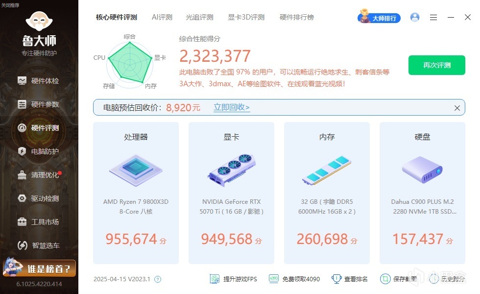 ▼简单跑个整机测试,整机得分232.3W,其中处理器单独得分95.5W、显卡单独得分94.9W,分数都很高。