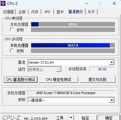 ▼简单跑个CPU-Z的测试,单核得分819.2、多核得分8537.9。