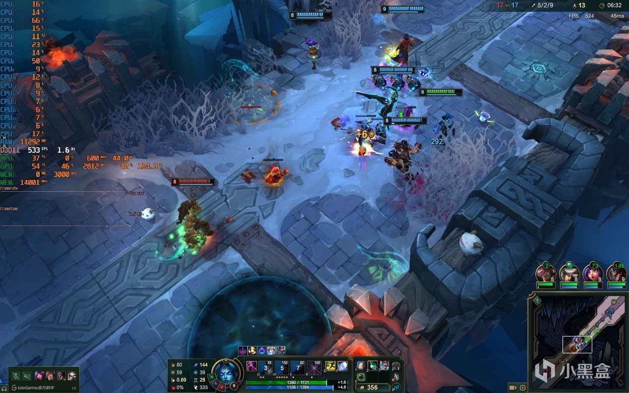 ▼日常团战情况,游戏帧数也能保持在530帧以上。这颗9800X3D,面对LOL还是猛的。