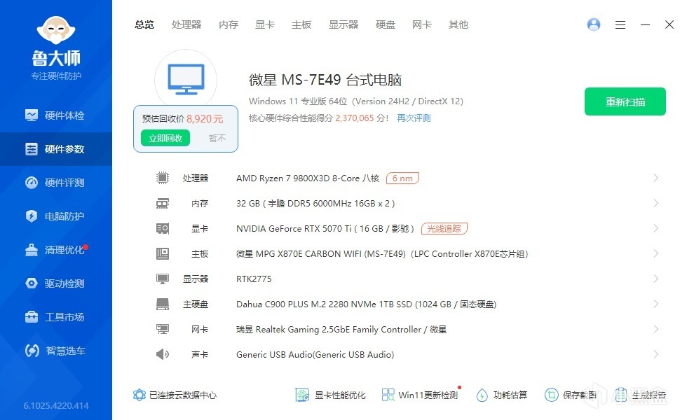 ▼整机配置一览,处理器是9800X3D,主板是微星的X870E暗黑,显卡是影驰的RTX 5070 Ti金属大师黑金版OC。