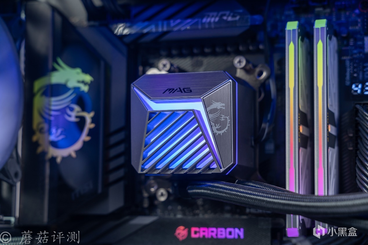 ▼微星MAG冰刃A15一体式水冷,水冷头表面采用经典的微星迫击炮系列涂装,搭配大面积的ARGB灯效,颜值很漂亮。