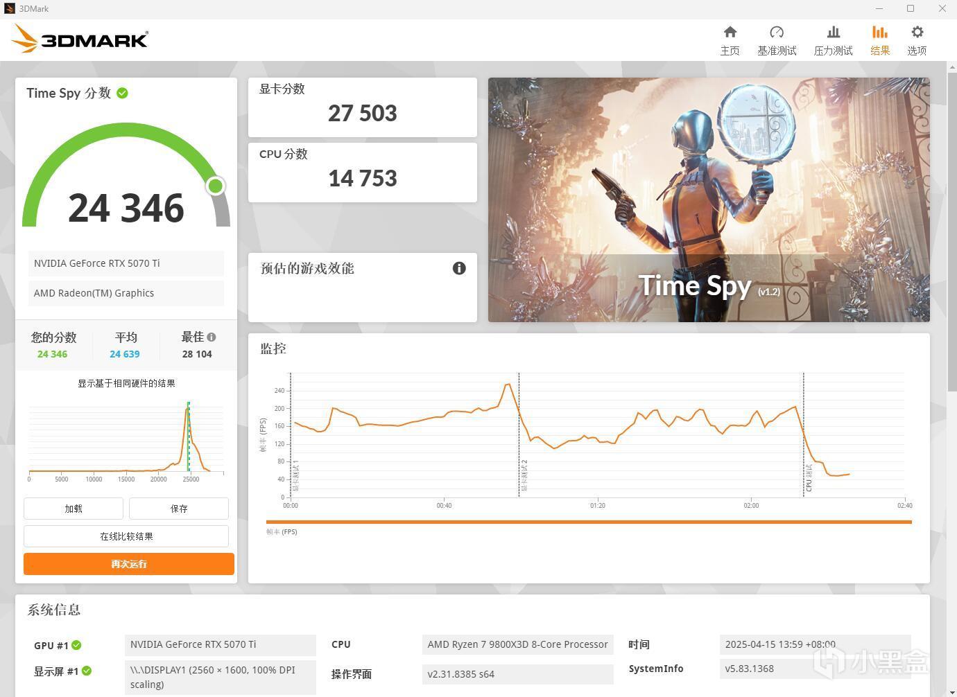 ▼跑个3Dmark的TS测试,显卡分数27503,CPU分数14753。
