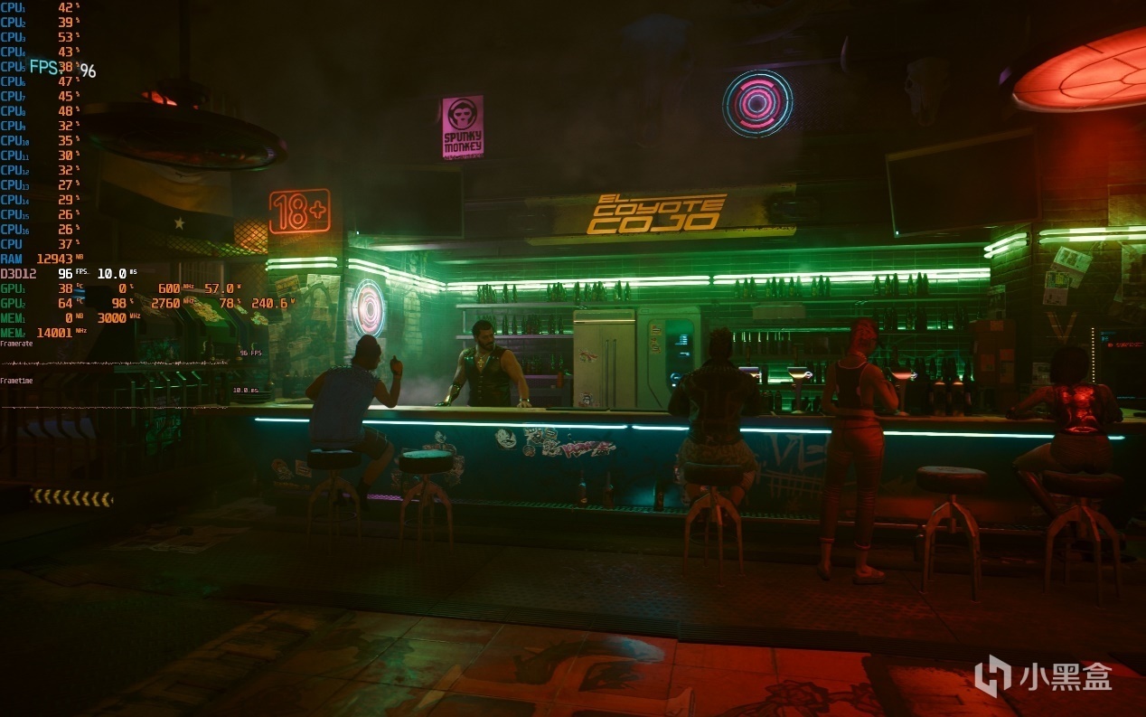 ▼酒吧吧台游戏帧数在96帧左右,显卡占用98%。