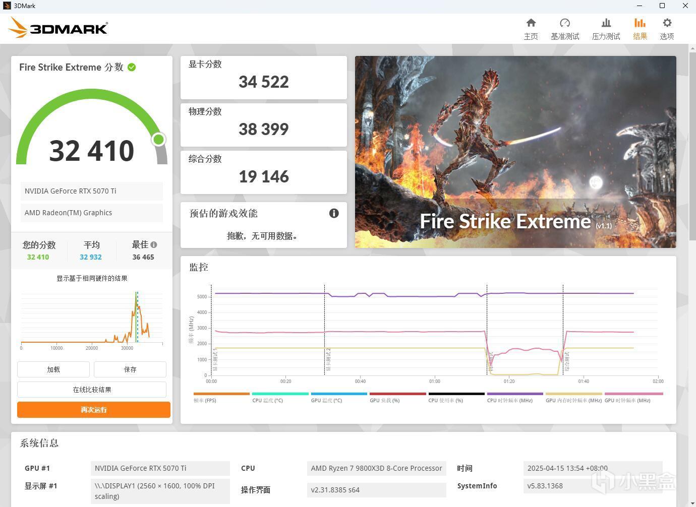 ▼跑个3Dmark的FSE测试,显卡分数34522,物理分数38399。