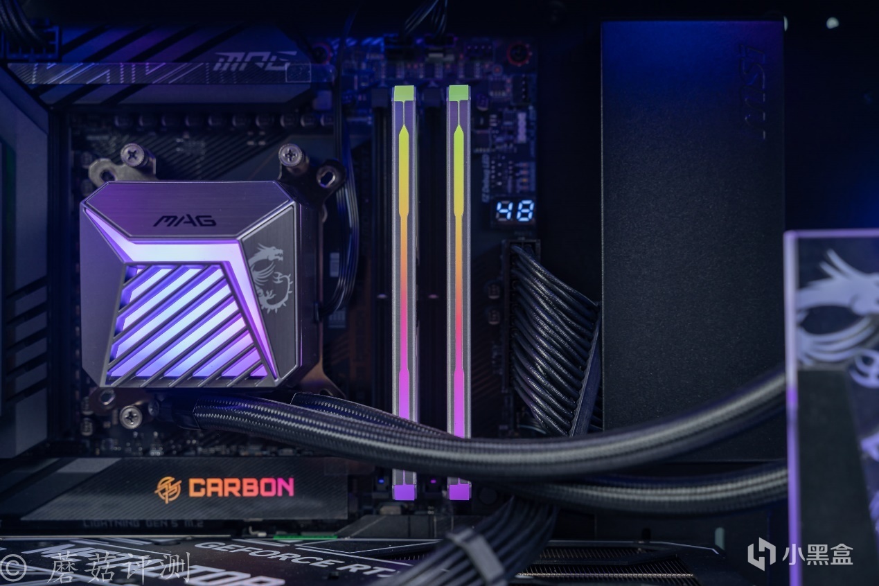 ▼内存条侧面是多段式的RGB灯带,用RGB灯带做两种不同表面处理的金属马甲的分界线,很有设计感。