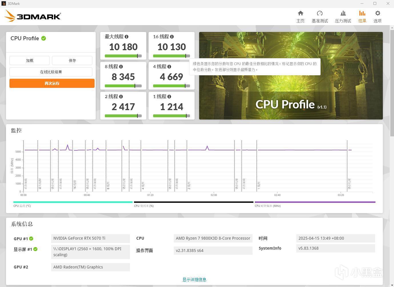 ▼跑个3Dmark的CPU测试,1线程得分1214,8线程得分8345,最大线程得分10130。单线程性能表现不错,8核性能也还行,但AMD的超线程性能确实不太行。