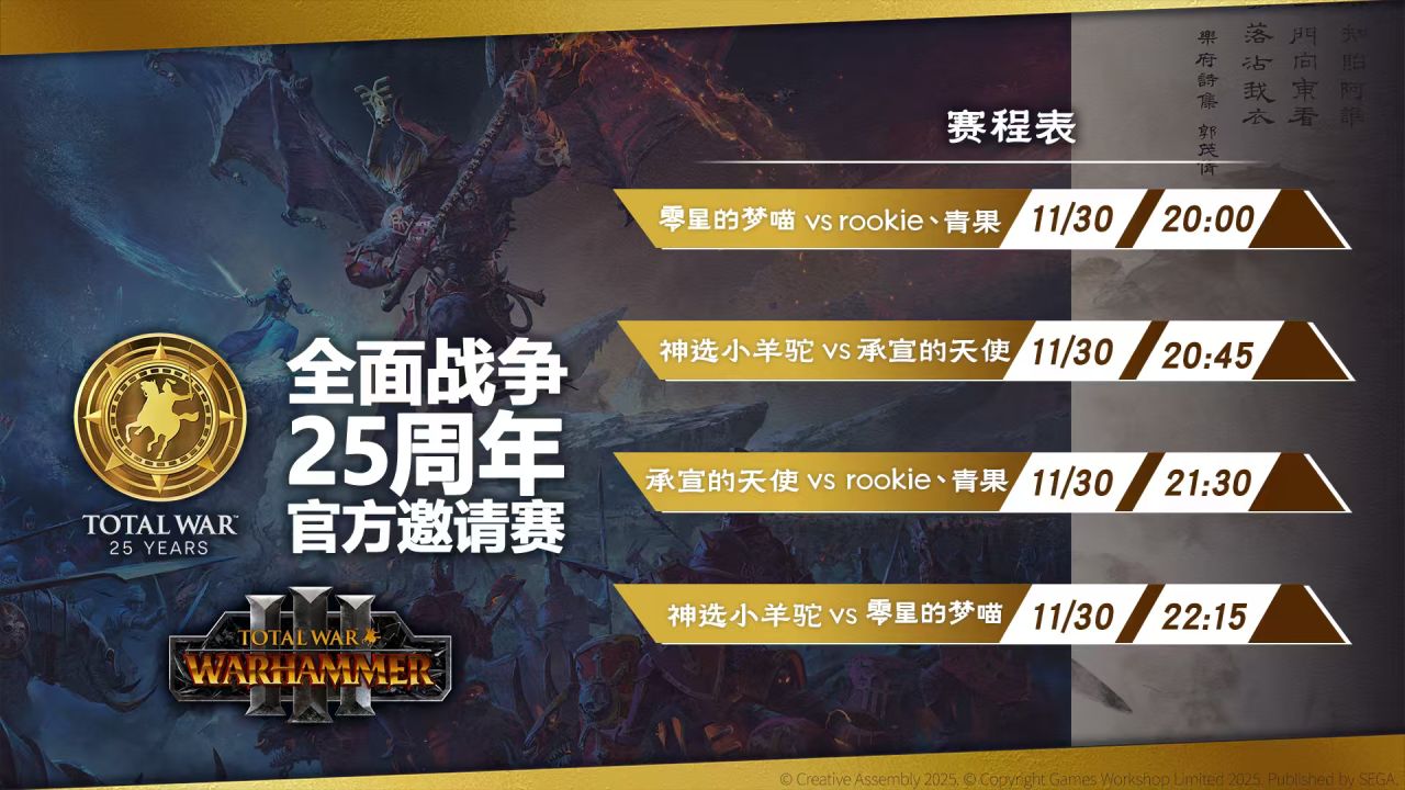 【全面战争25周年官方邀请赛】 2025-11-30 PC游戏 【全面战争25周年官方邀请赛】继昨日,《全面战争:战锤3》的比赛现已再次开播!本次赛事由全面战争系列资深玩家提供解说,欢迎新老玩家观看!点击跳转活动 更多游戏资讯请关注:电玩帮游戏资讯专区 电玩帮图文攻略 www.vgover.com