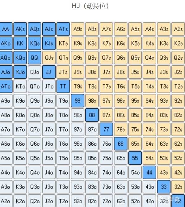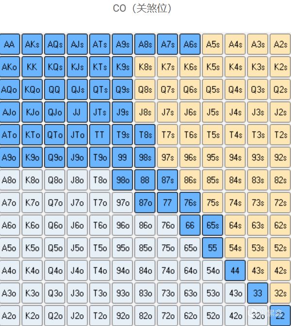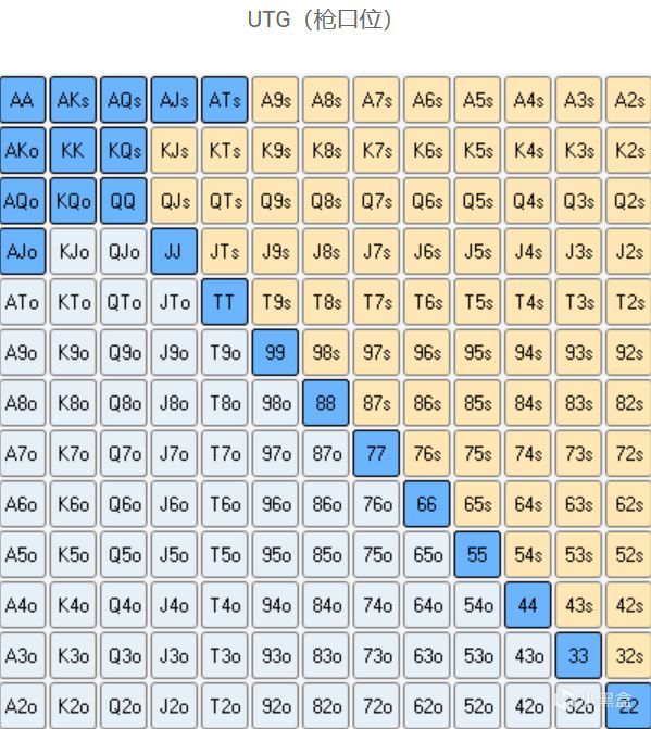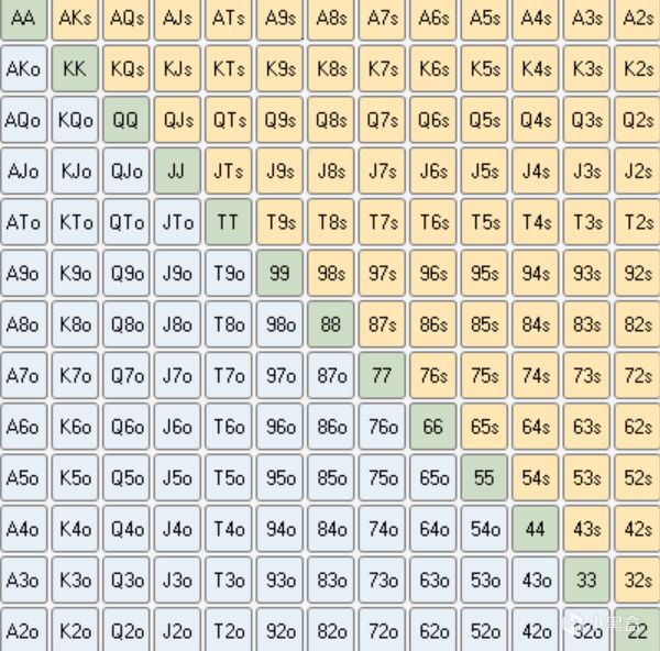 因为不同起手牌的强度不同,我们在游戏中不会选择玩所有起手牌,在矩阵表中选出游戏的部分起手牌就形成了范围表。