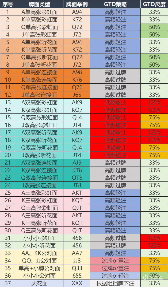 首先说明,每一种牌面GTO的下注尺度并不是一种,表格只是为了便于记忆,采用了一种下注尺度。实战时很多情况都是既可以bet 33%底池,也可以66%,也可以125%的,所以这时根据双方的后手筹码、底池大小、粘池程度、对手形象、自身形象等进行下注尺度的调整更为关键。