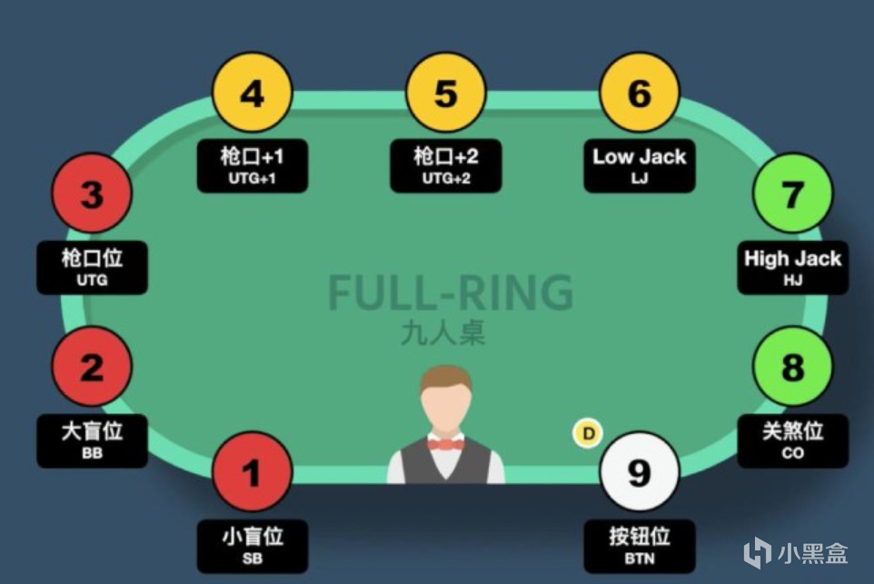 9人桌是最完整的牌桌,位置最复杂,对范围的要求也最严格。
