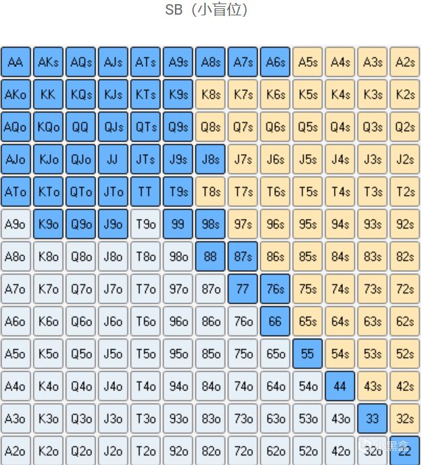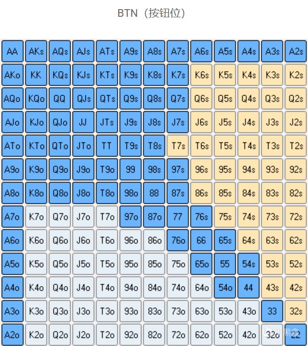 因此,open范围表没有大盲位,因为大盲位翻前最后行动,前面玩家都弃牌时,就已经获胜了。