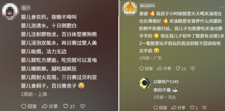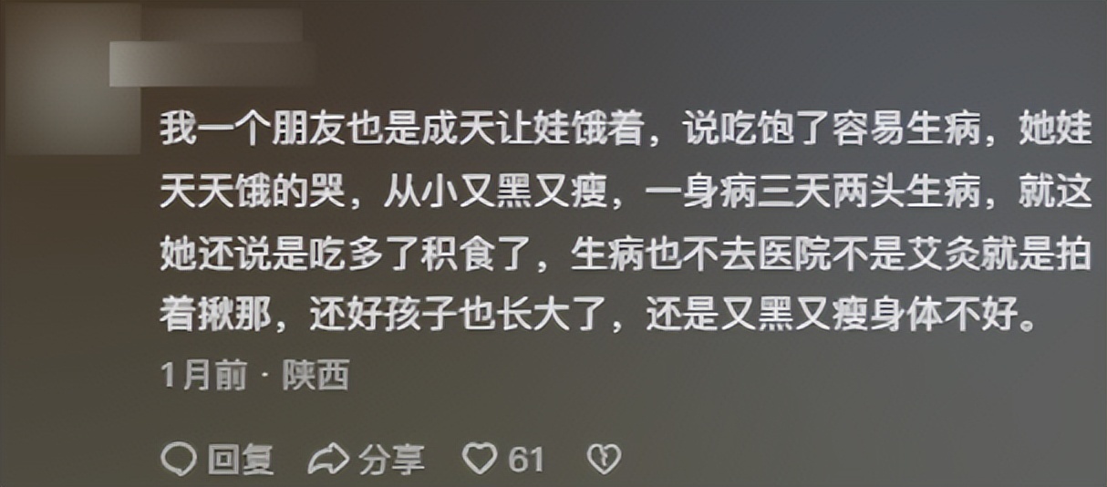 最一开始,不少网友在看到孩子的惨状后,纷纷在评论区好言相告,劝这些家长摒弃古法,遵循科学喂养。但家长们用一个“老祖宗的智慧”,就将所有劝诫都挡了回去——营销号说了,西方蛮夷的现代医学才发展多少年?怎么就比得过上下五千年的传承?