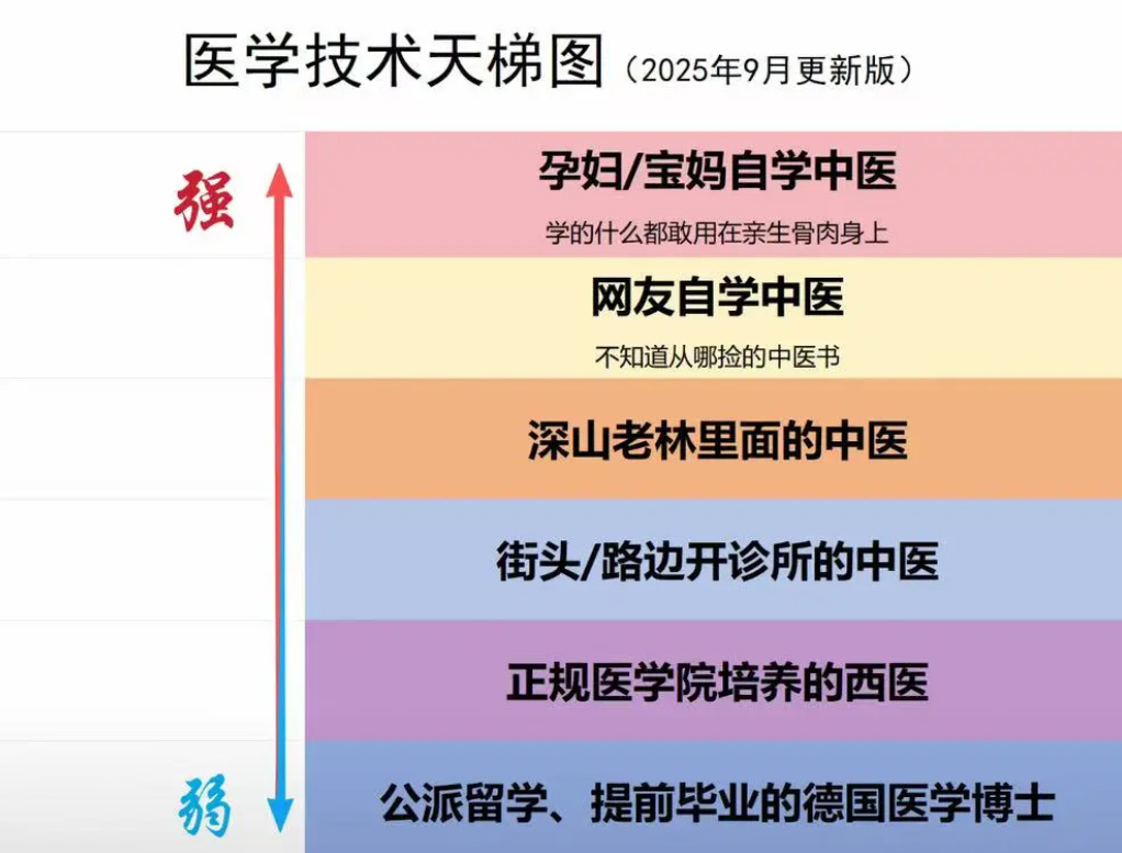 哪怕医学生现身说法,职业医师苦口婆心,据理力争这些古法都是“伪中医”,古法家长也只觉得他们不过是“火候不到家”,最好多学几年,再过来好为人师。毕竟,正所谓“高手在民间”——如果要从夯到拉给家长心中不同群体的医学技术排个名,那么越学术权威的就越拉,越野路子的就越夯,半路出家自学成才的自己更是夯中之夯。无论身边亲戚和网友如何劝说,这些家长都油盐不进,除了米油。