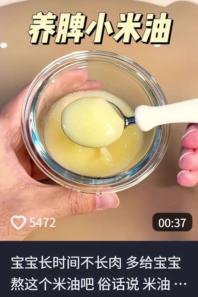 所谓“米油”,也不是什么稀罕物,甚至在生活中相当常见,它就是煮米粥时,浮于锅面上的浓稠糊状物。其实,给婴幼儿喂食米油这事,从古至今一直都有,但以往多是因其易消化,在孩子肠胃功能较弱时作为辅食添加,并没有什么特殊的营养价值。但就是这平平无奇的米油,在(自称)深谙中华上下五千年博大精深中医文化的家长眼里,是米中精华的凝聚,是谷气津液之所成,完全超过了“天上斑鸠、地上驴肉”,除了拥有足以平替母乳的营养,更是有补肾健脾、利水通淋等多种功效。
