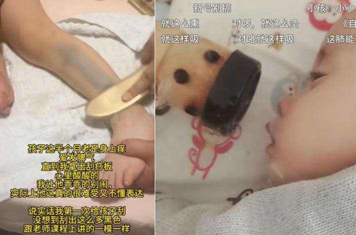 除此以外,还有全然不顾是否适龄,便开始给宝宝刮痧艾灸的狠活。听到孩子撕心裂肺的哭声,知道的明白这是在古法养娃,不知道还以为这是在严刑逼供。