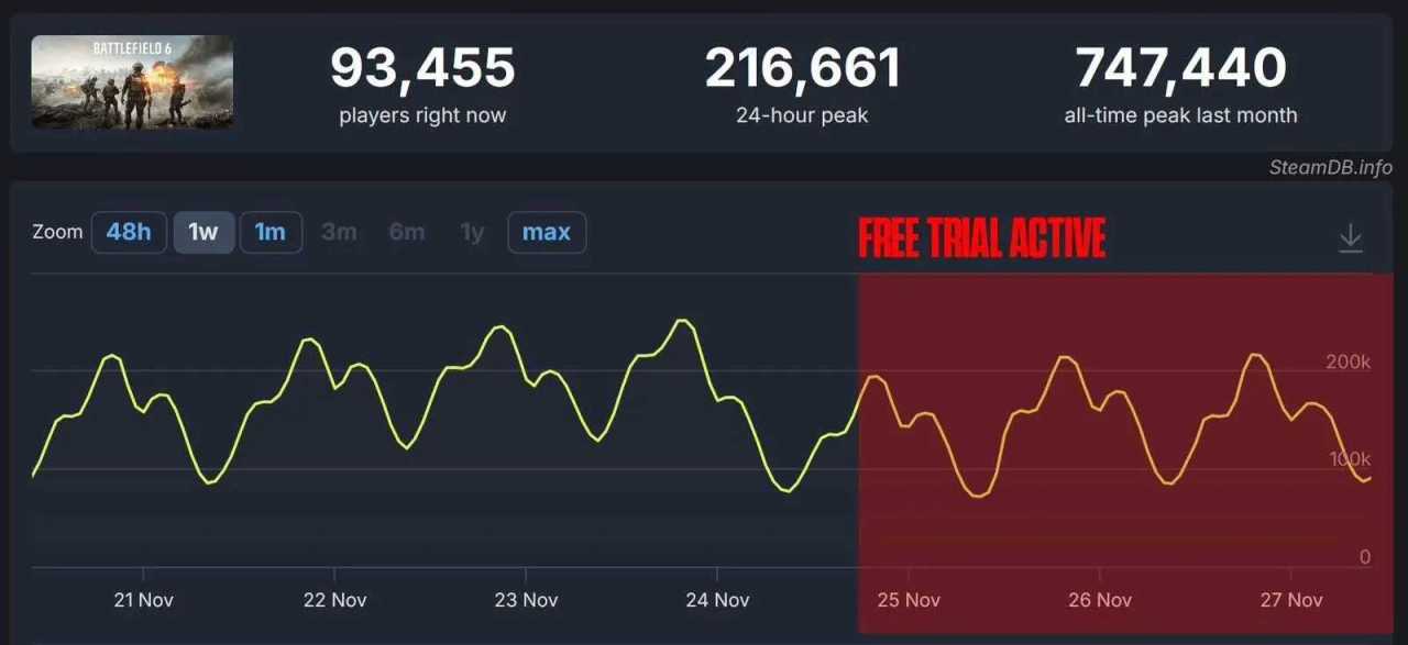 EA近期宣佈《戰地6》成爲本年度“最暢銷射擊遊戲”,銷量表現優於《黑色行動7》與《ARC Raiders》。然而亮眼銷量背後,遊戲的玩家活躍度卻呈現持續下滑趨勢。