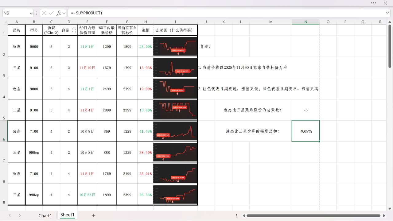 近期老看到有人說致態漲價是不得不漲、漲得最少漲得最晚,遂花了點時間做了個近期的統計查證了一下漲得到底有多晚漲得到底有多少,包括當前京東自營價格(比如像9100pro現在京東亞馬遜4t 2443就不計入內),60天內最低價的時間以及當前價格相較60天內最低價的漲幅。