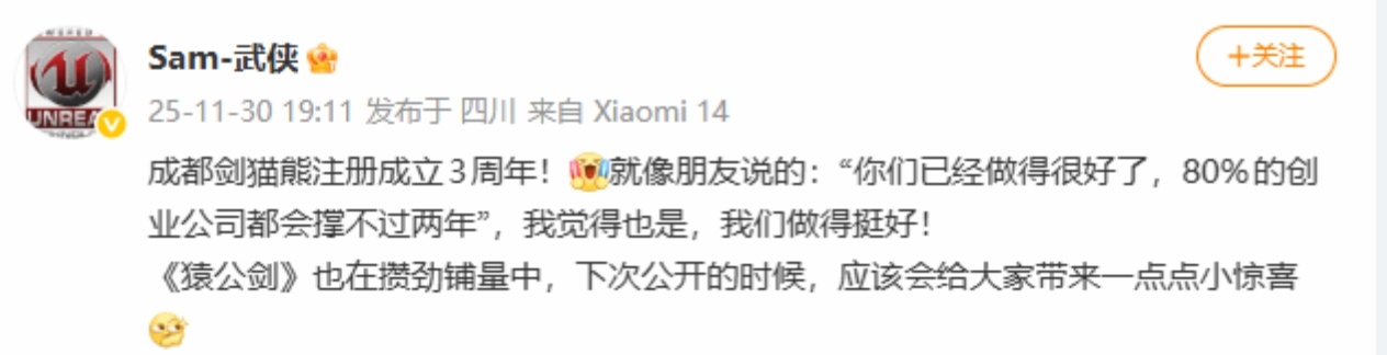 11月30日,国产动作游戏《猿公剑》制作人@Sam-武侠在微博发文,庆祝团队“剑猫熊”成立三周年。他引用朋友的话说:“你们已经做得很好了,80%的创业公司都会撑不过两年”,并对团队表现表示肯定。