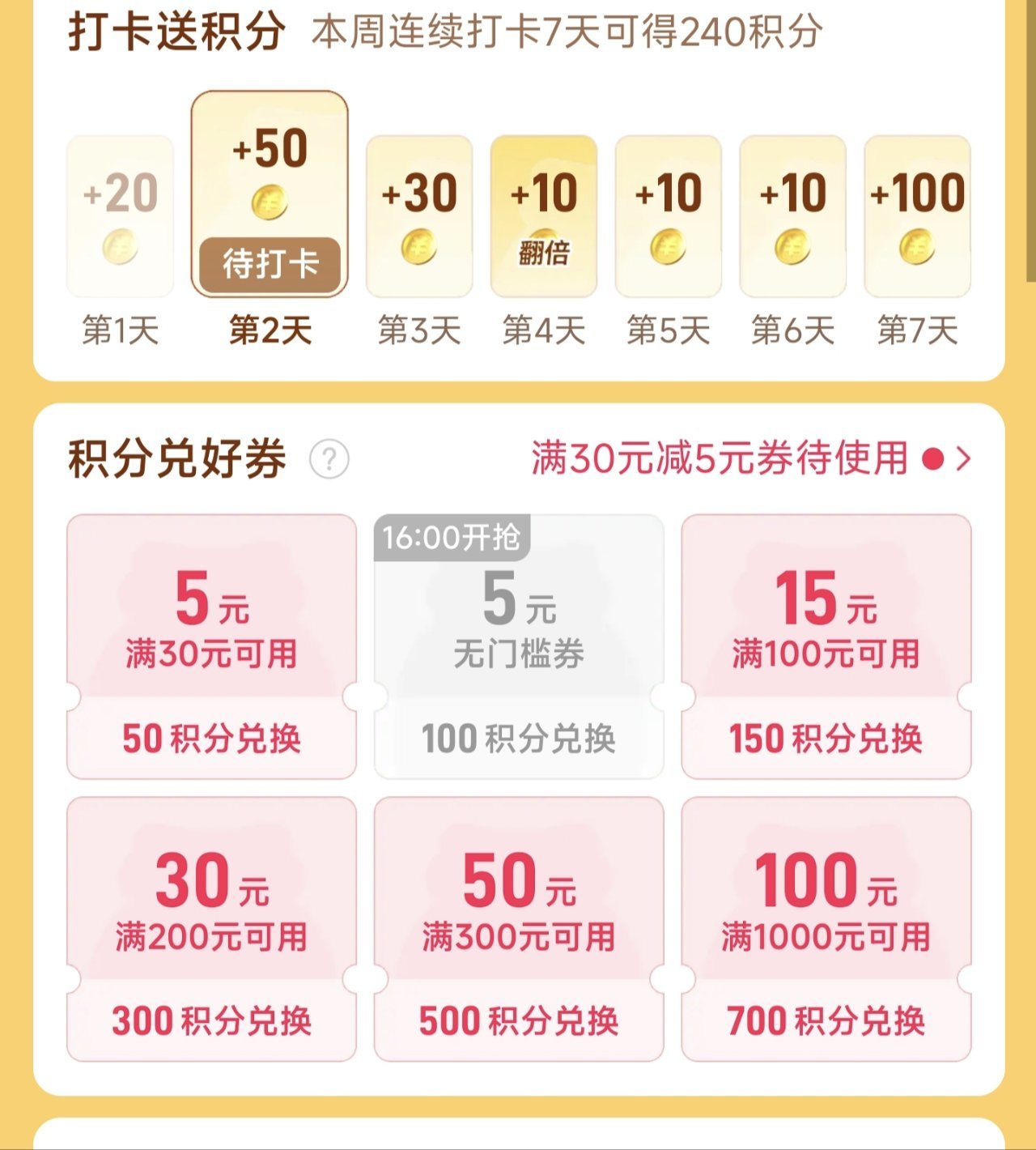 百亿补贴每次整点有机会用积分换无门槛五元劵也不错。如果忘了就定个时间挺好抢的。就是要注意有周次限制(好像是一周两次)所以要买什么东西可以先放ˣ收藏ˣ里面。有劵再买就可以省一点钱了。