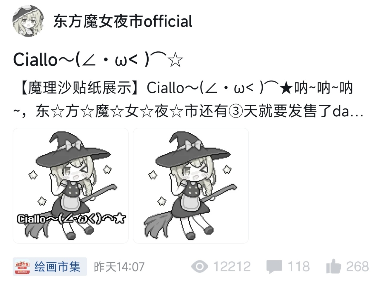 还有两天马上就要发售了!!!如果是通过这次的Ciallo~(∠・ω< )⌒★事件才知道到我们的朋友也欢迎了解东方魔女夜市呀